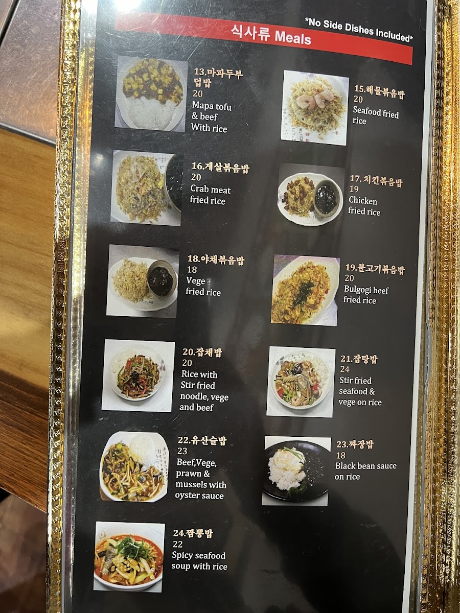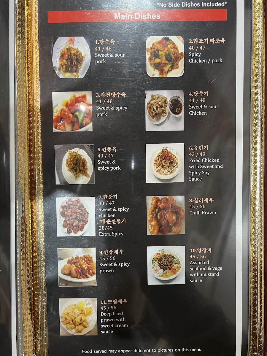 The menu is further complemented by a range of well-known Korean dishes including black bean noodles, various banchan (side dishes), fish roe soup, seafood pancake, fried chicken with sweet and spicy sauce, spicy beef soups, and rice dishes with jap-chae, among others.